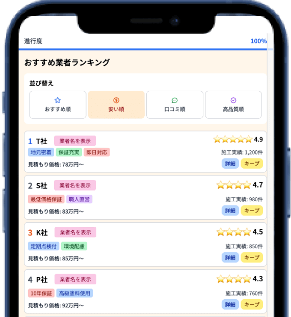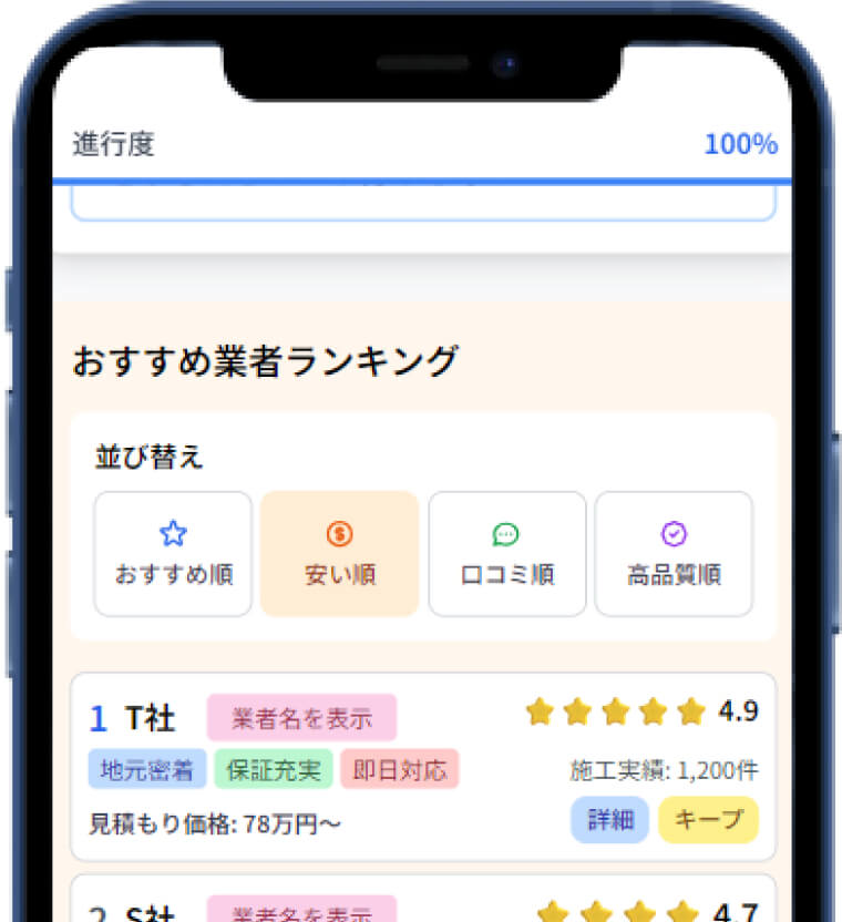 コスパ順、クチコミ順、品質順のランキングから、お好きな業者の情報で比較できます!
